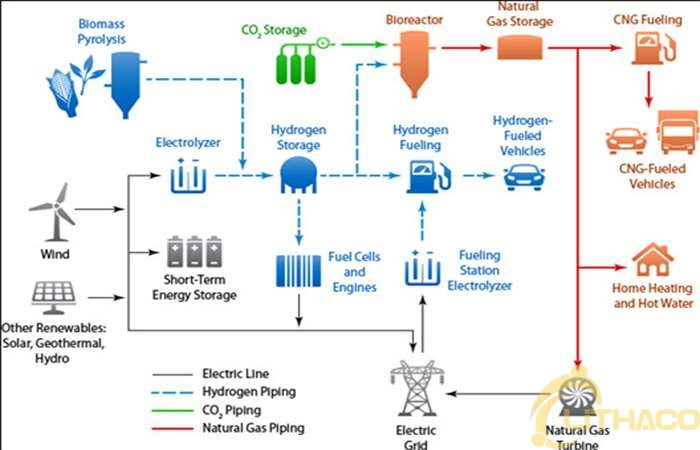 – Năng lượng H2 có thể được sản xuất, lưu trữ, vận chuyển trong hạ tầng vận chuyển khí thiên nhiên (LNG) hiện nay, có thể được sử dụng dưới dạng chuyển đổi thành điện năng hoặc khí đốt như CH4 cho các nhu cầu như sinh hoạt, công nghiệp, chăn nuôi hay làm nhiên liệu cho các phương tiện giao thông.